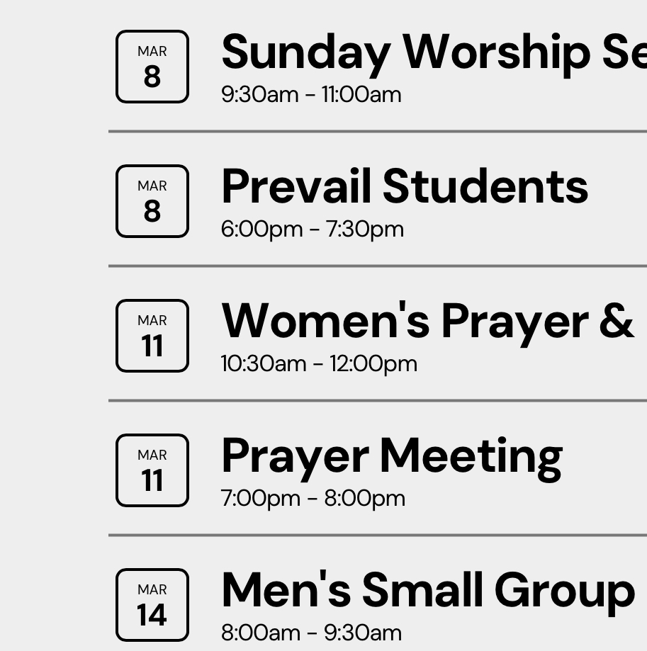 We meet on Sundays in person and online at 9:30am. Prevail Kids ministry occurs at the same time.